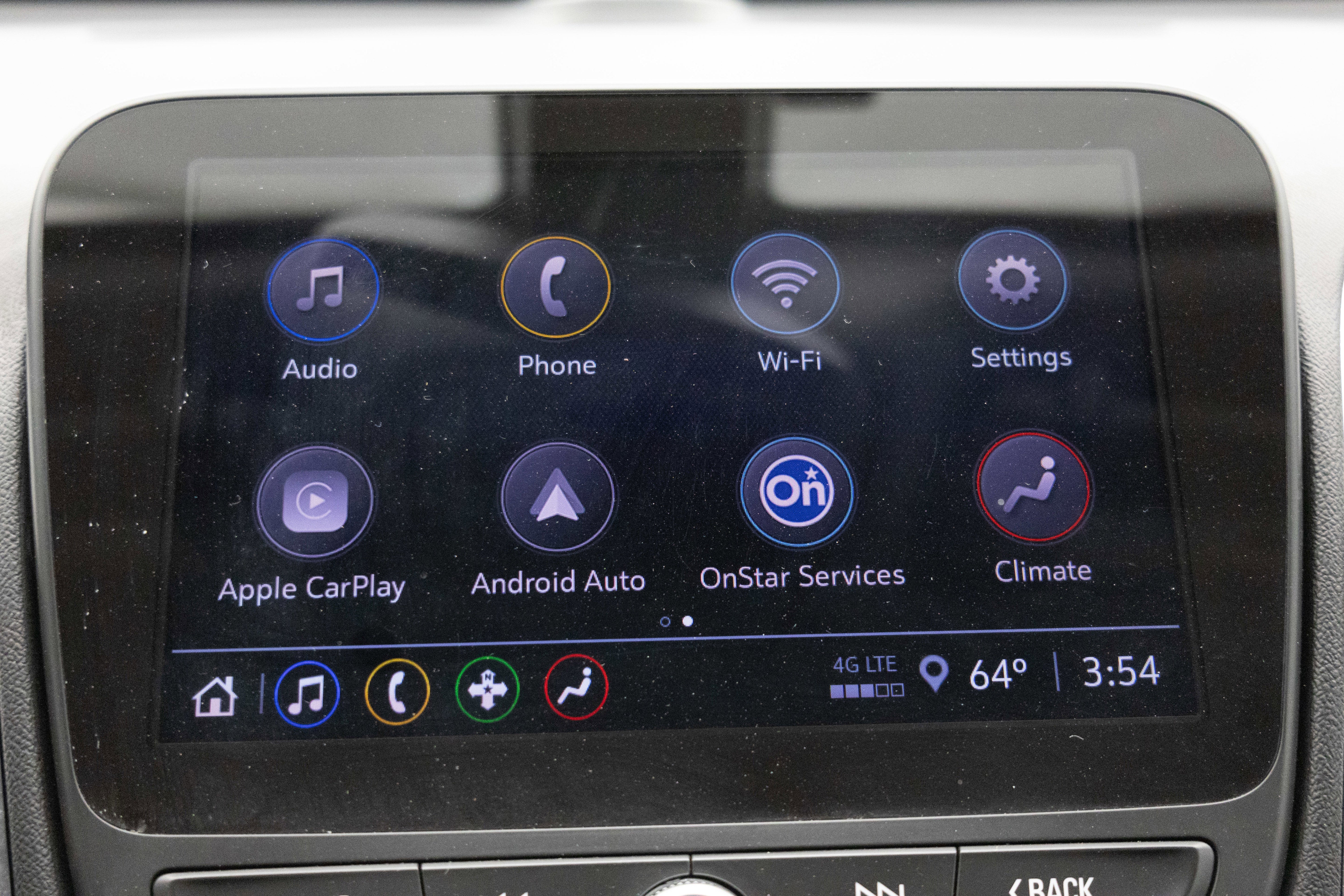 - Audio system, Chevrolet Infotainment 3 system, 8" diagonal color touchscreen, AM/FM stereo. Additional features for compatible phones include: Bluetooth® audio streaming for 2 active devices, voice command pass-through to phone, Apple CarPlay and Android Auto capable.